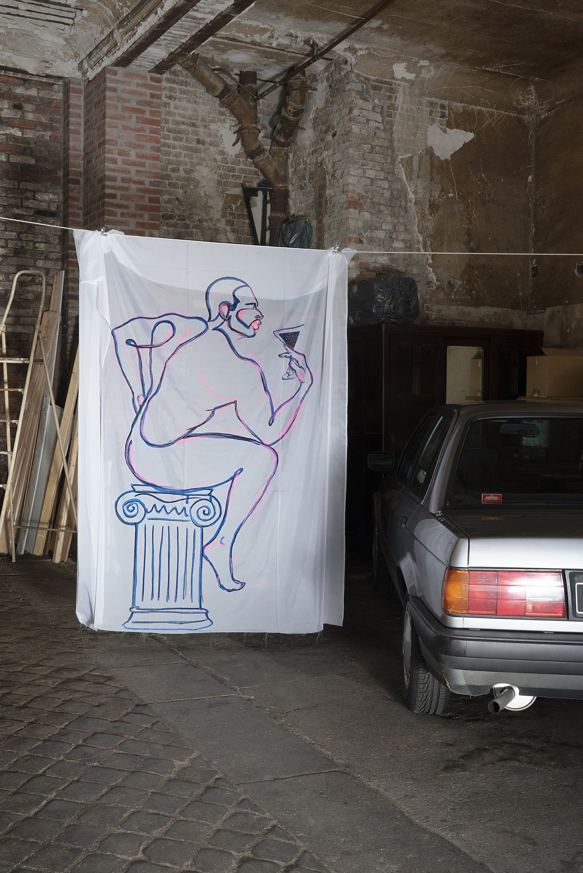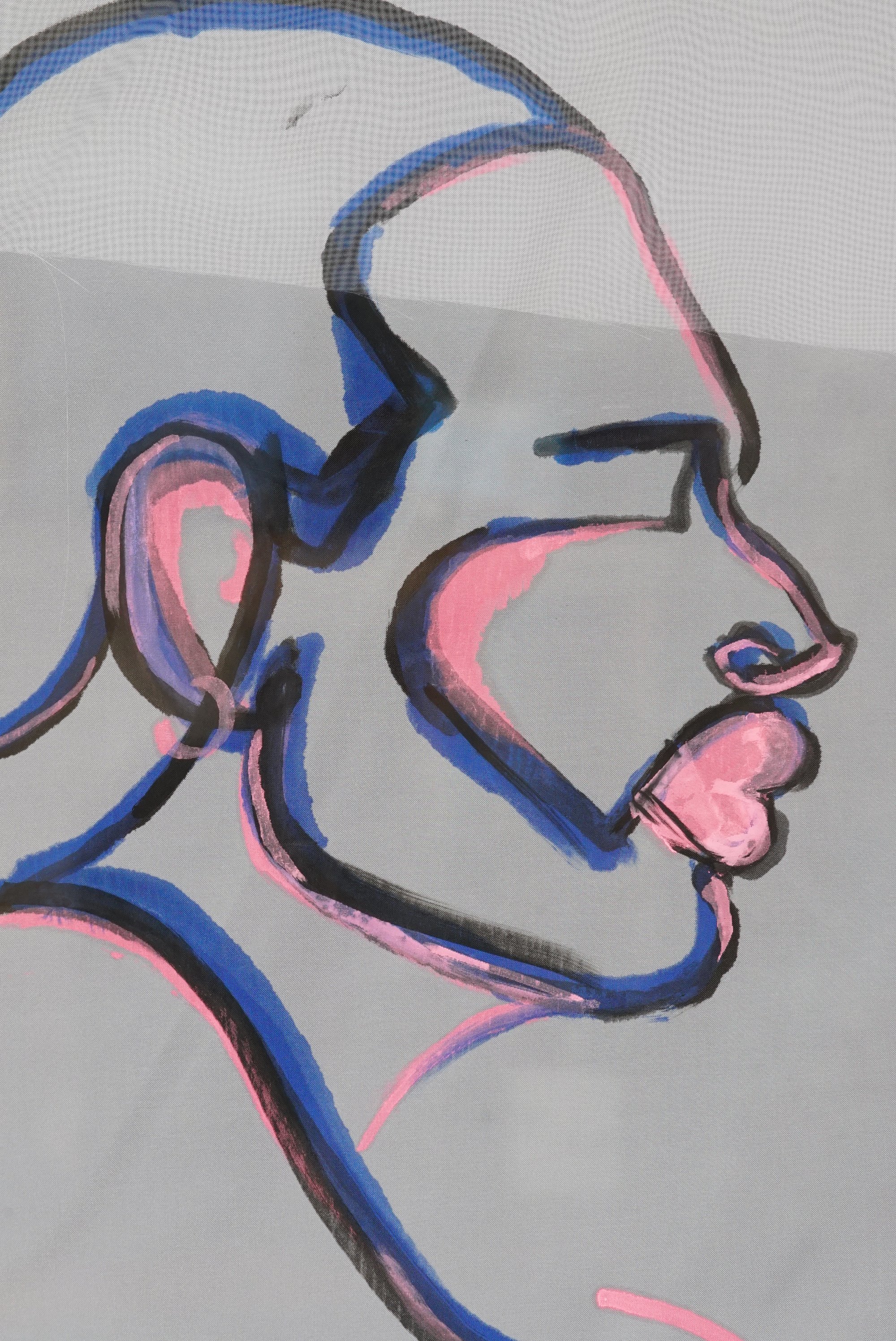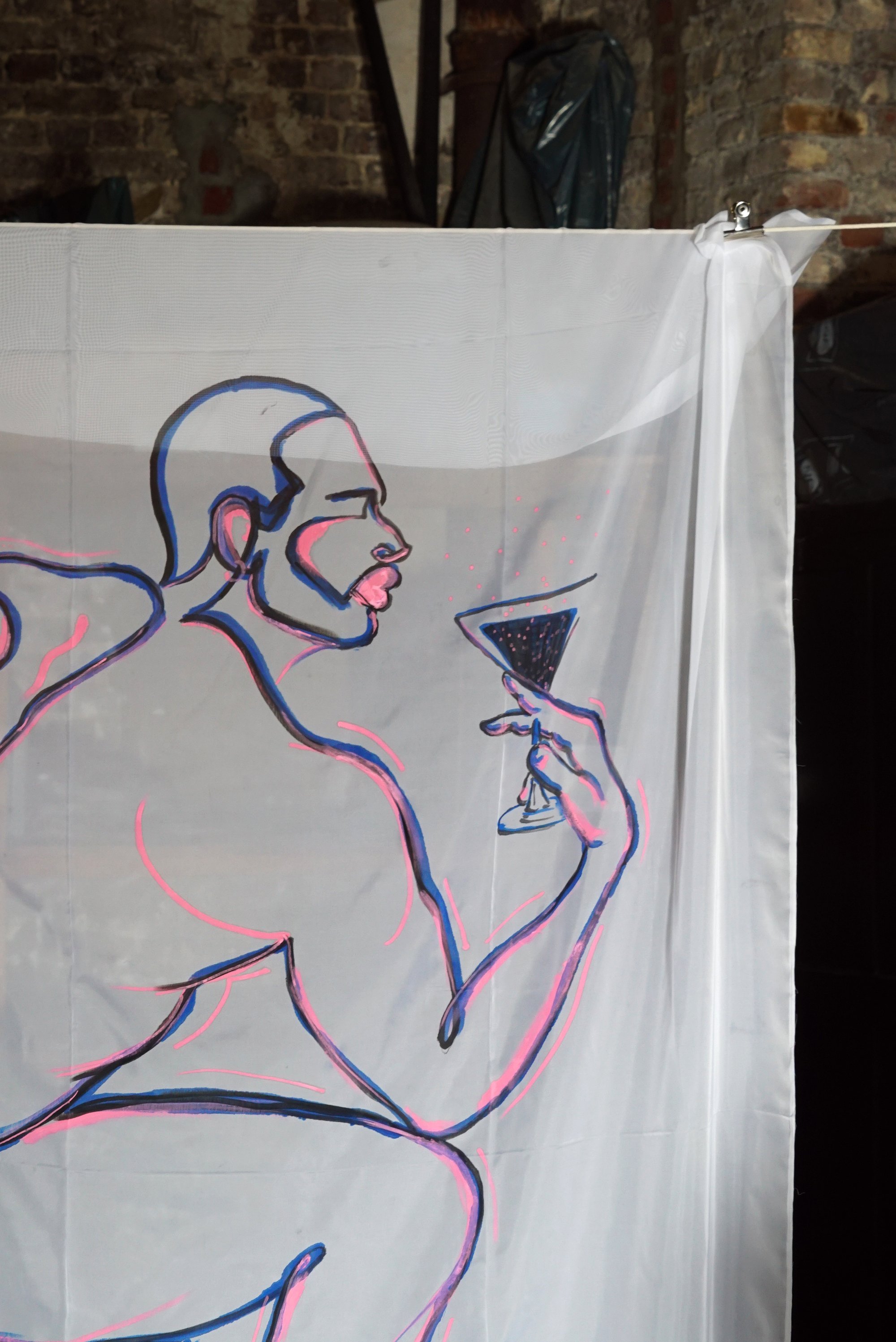 Drawn by hand with acrylic markers on white voile, this piece explores the tension between material and transparency.